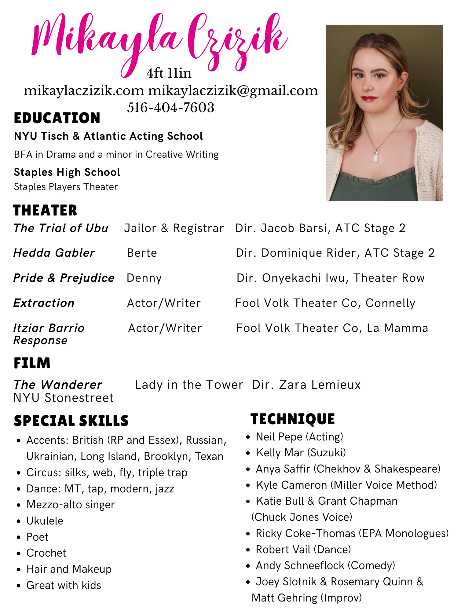 When I was five, I sat on Santa's lap and asked for world peace on Christmas, which is pretty funny for a Jewish only child. Two decades later, I have yet to see my wish fulfilled in the literal sense, except for these sublime moments when I witness art magically heal people in the moment. I felt it when I debuted my poem, Fleeting Friends and Feelings, dedicated to the friends I’ve lost to mental illness at the La Mamma Galleria Helen Lavelle exhibit. I felt it when I sang and played My Body Is My Buddy on my ukulele at an LGBTQIA+ Pride Parade event. I felt it when performing as the Registrar and Jailor in Simon Stephens’ timely play The Trial of Ubu at Atlantic’s Stage 2 Theater. And I certainly felt it in May 2025 when I graduated from NYU Tisch and The Atlantic Acting School. I treasure the privilege of gaining ardor, rigor, and ease in my training and daily practice. And I couldn’t have done it without the guidance of my professors, coaches, and peers. Production Photos